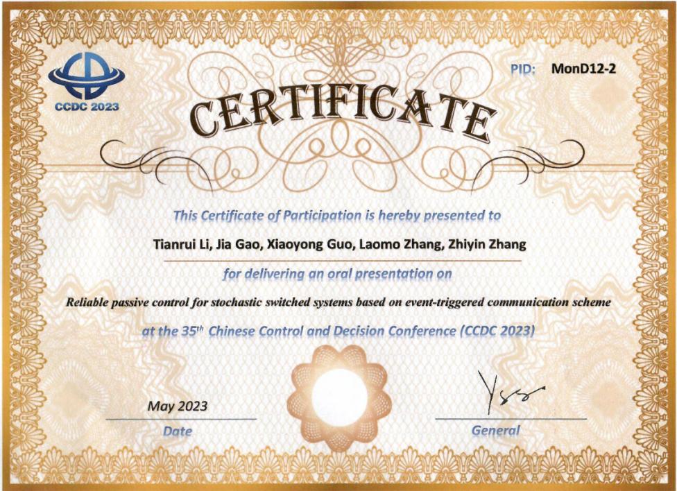 此次会议上,我院青年教师李天瑞博士作了题为“Reliable passive control for stochastic switched systems based on event-triggered communication scheme”的学术报告。李老师介绍了网络随机切换系统的研究背景和进展,重点分享了网络随机切换系统在执行器故障以及事件触发机制下的无源性的最新研究成果。报告得到与会专家的一致好评,组委会授予李天瑞老师优秀报告奖,并颁发了证书。