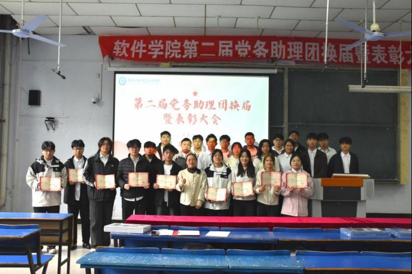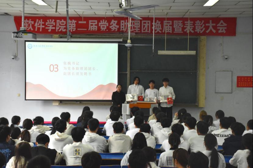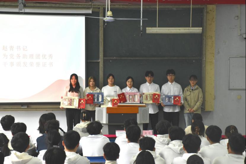 随后,大会进入隆重的表彰环节。软件学院学生第二党支部书记赵青为党务助理团优秀干事颁发荣誉证书,表彰他们在工作中的突出表现。这些优秀干事以实际行动彰显了党务工作者的担当与初心,为大家立起了标杆。